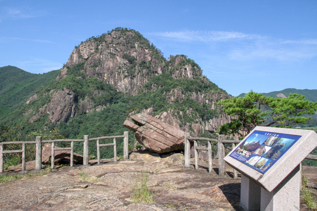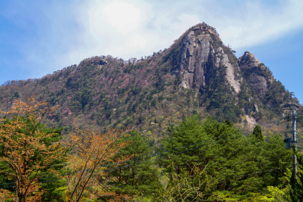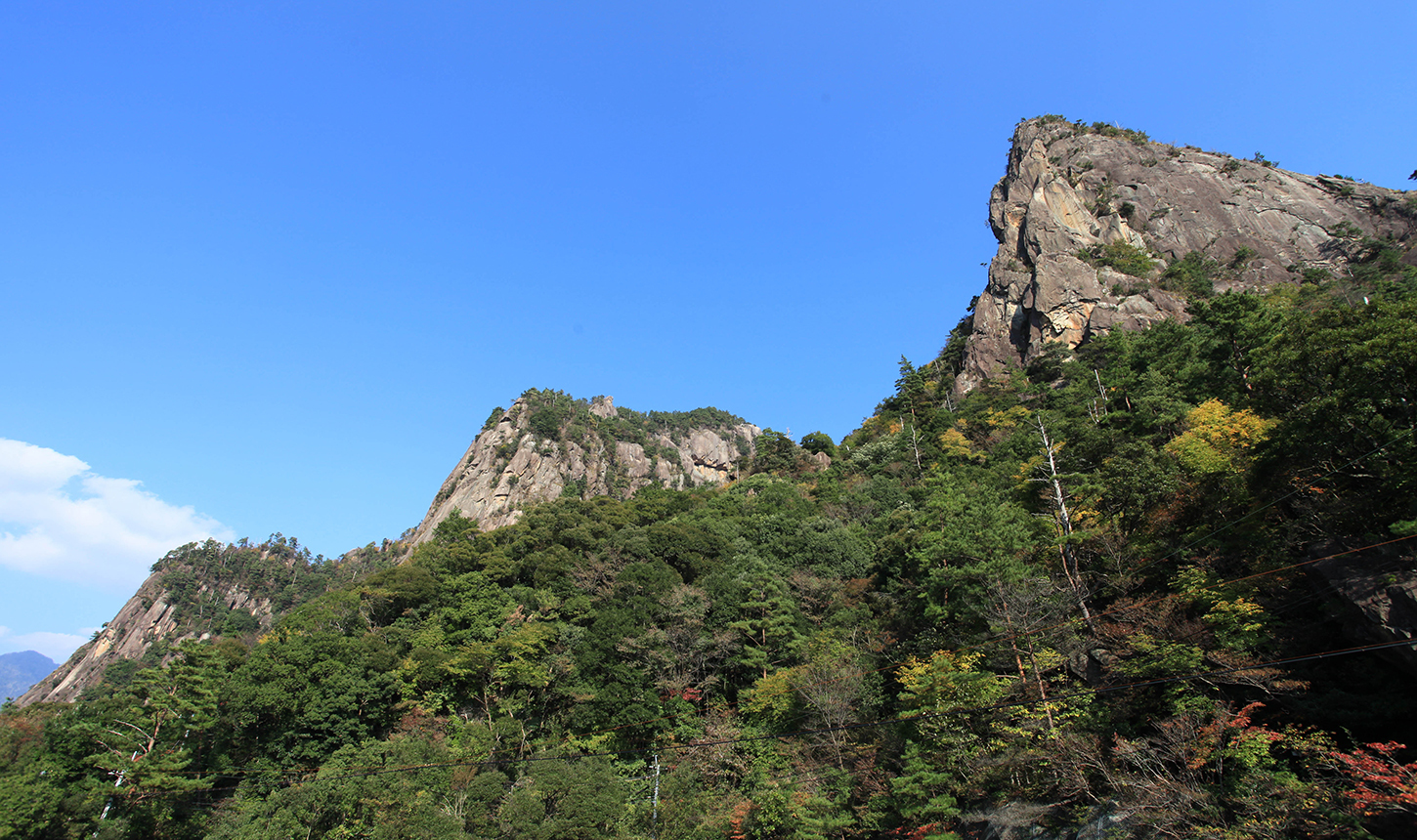 標高760メートル。昭和14年に国の名勝として指定されたこの山は、一枚岩の花崗岩が連なり、中国の山水画を思わせるような展望が広がります。また、ロッククライミングの名所として全国に知られ多くのクライマーが訪れています。