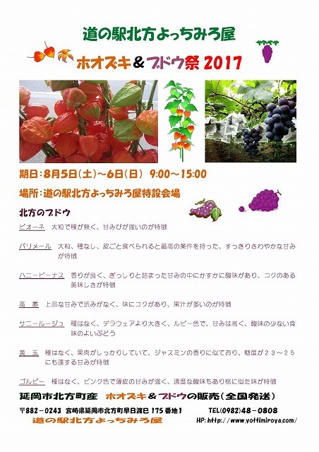 「道の駅北方よっちみろ屋 ホオズキ&ブドウ祭2017」を開催いたします。